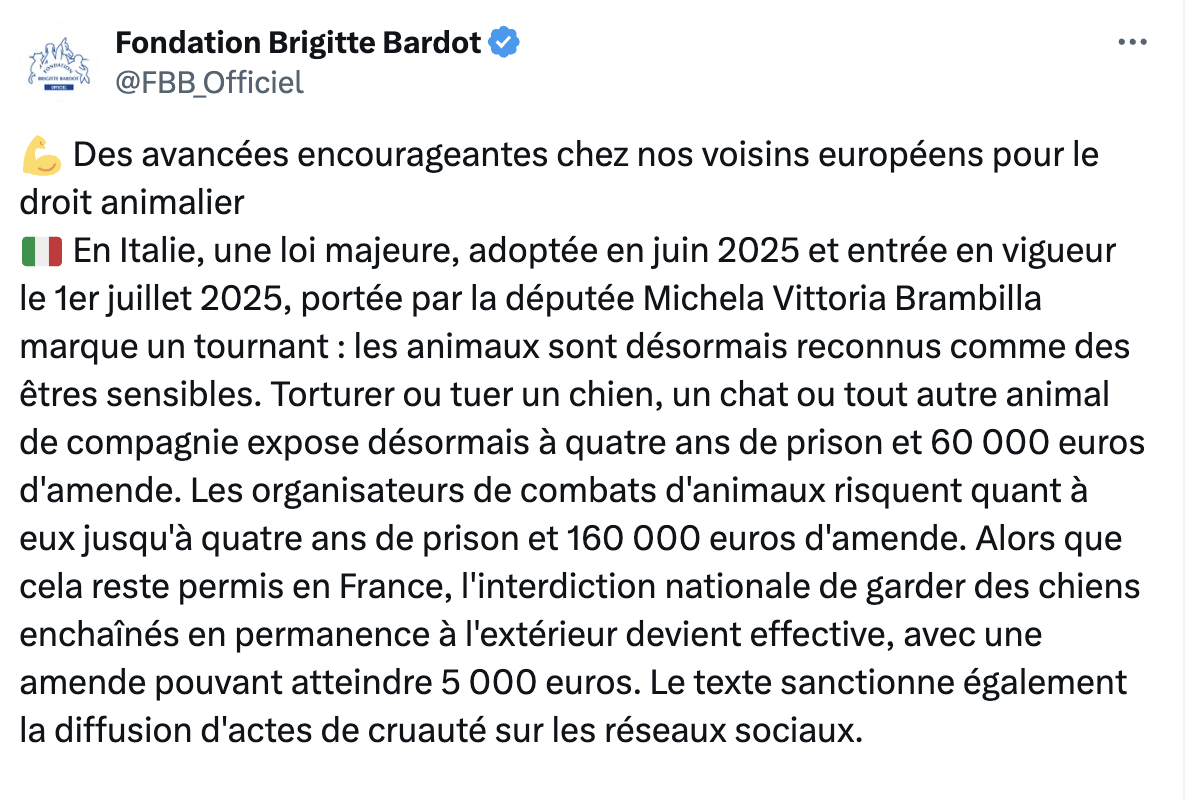 Nei giorni scorsi, con un post sul proprio account in X, la Fondazione Brigitte Bardot ha espresso apprezzamento per “des avancées encourageantes chez nos voisins ...